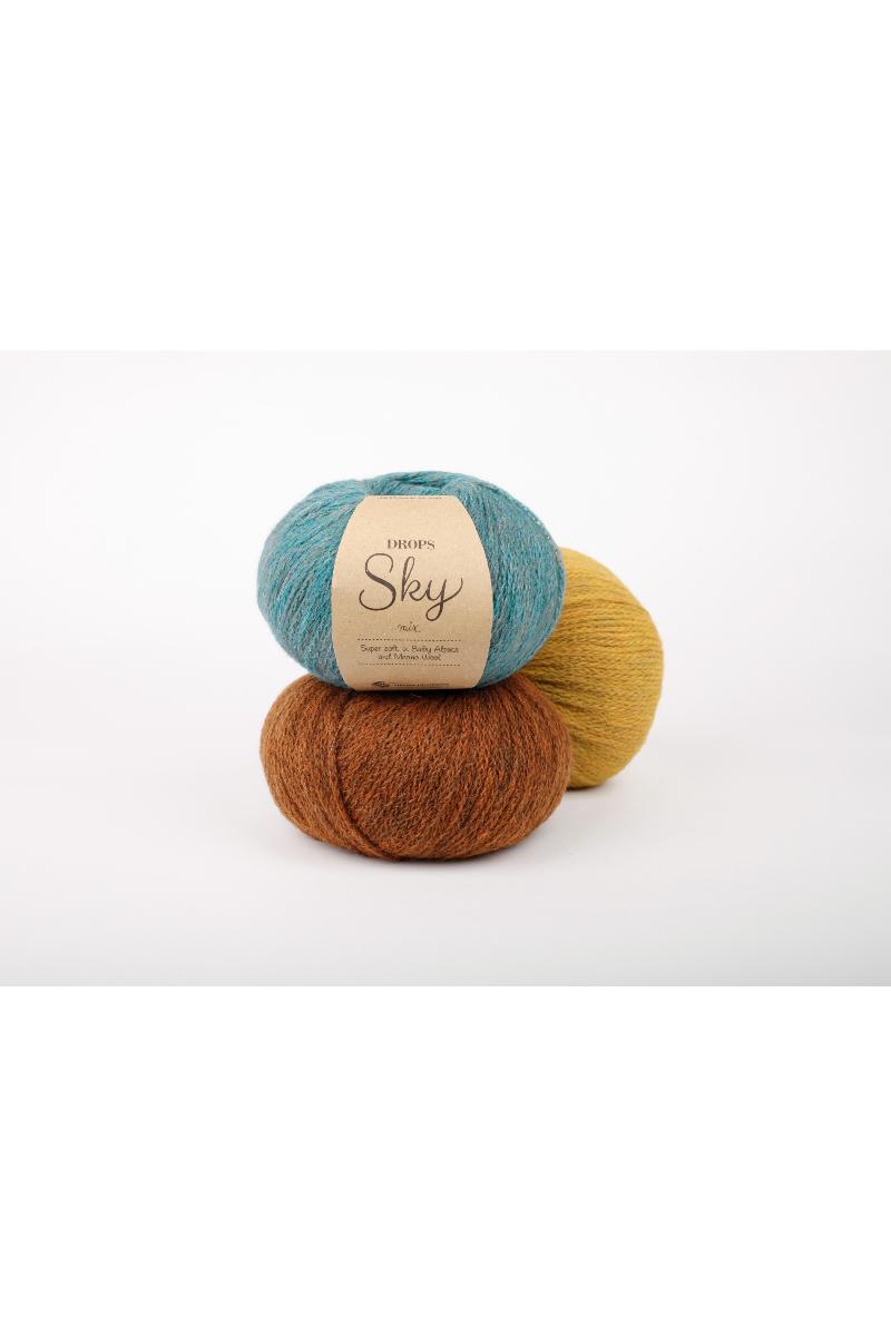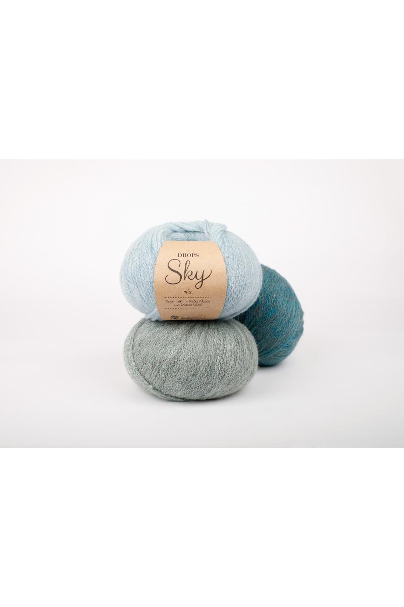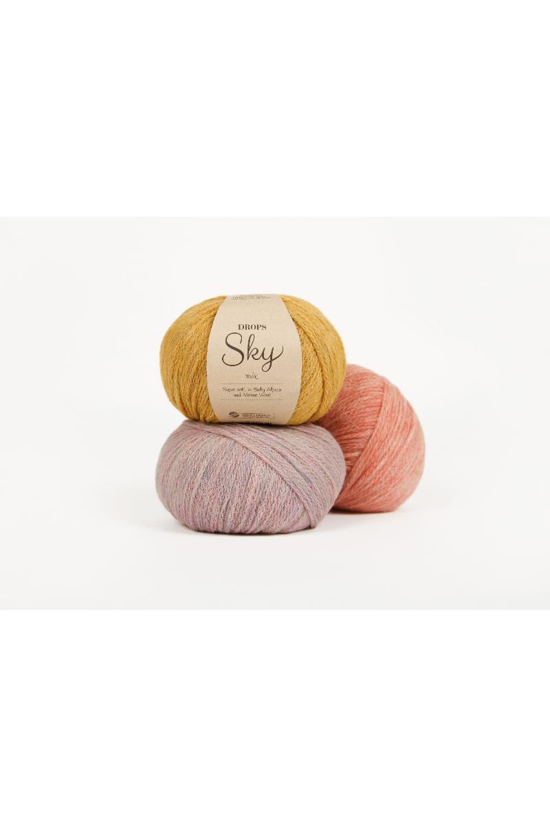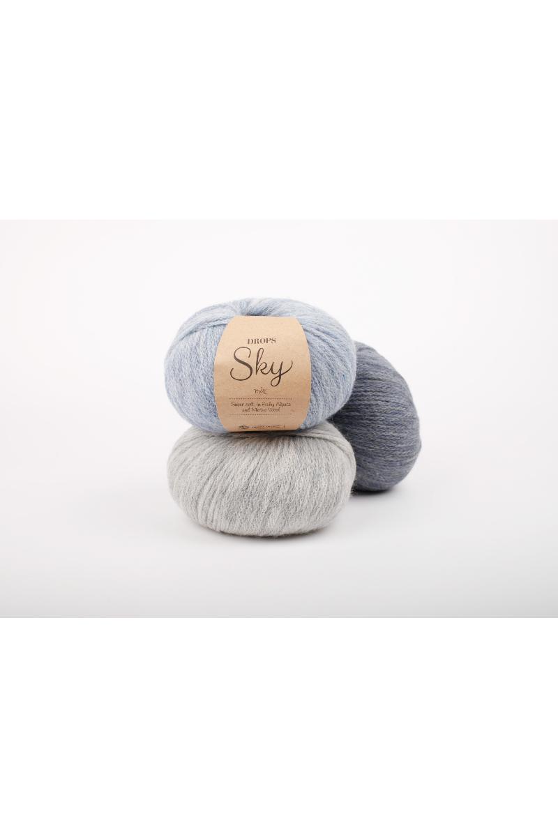 DROPS Sky er laget av 74% babyalpakka, 8% merinoull og 18% polyamid, det er supermykt og luksuriøst. Det føles likt som DROPS Air, men har en mer kompleks tubelignende struktur som gjør det meget lett, puster godt og er slitesterkt.