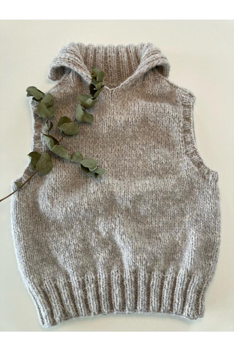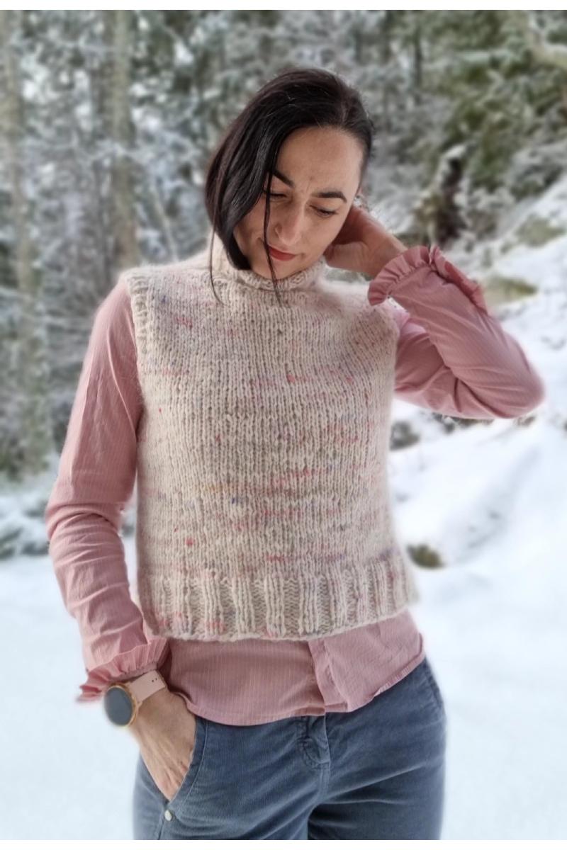 Vinterslipover er en myk og varm vest som kan brukes oppå det meste av bluser, gensere og kjoler. Vesten strikkes ovenfra og ned, og derfor kan det gjøres ulike valg og tilpasninger underveis ift uttrykk og passform: Halsen kan strikkes på to valgfrie måter, enten rundt på rundpinne slik at det blir en klassisk turtleneck, eller så kan ribben strikkes frem og tilbake slik at det danner en krage. Du kan velge å ha en rett modell, eller å strikke en diskret innsving nedover bolen. Lengden på bol kan enkelt tilpasses individuelt mens du strikker. Ribben nederst kan strikkes med valgfri splitt i siden. Vesten strikkes med dobbel tråd: en tråd Puno og en tråd Plum fra Rauma Garn.