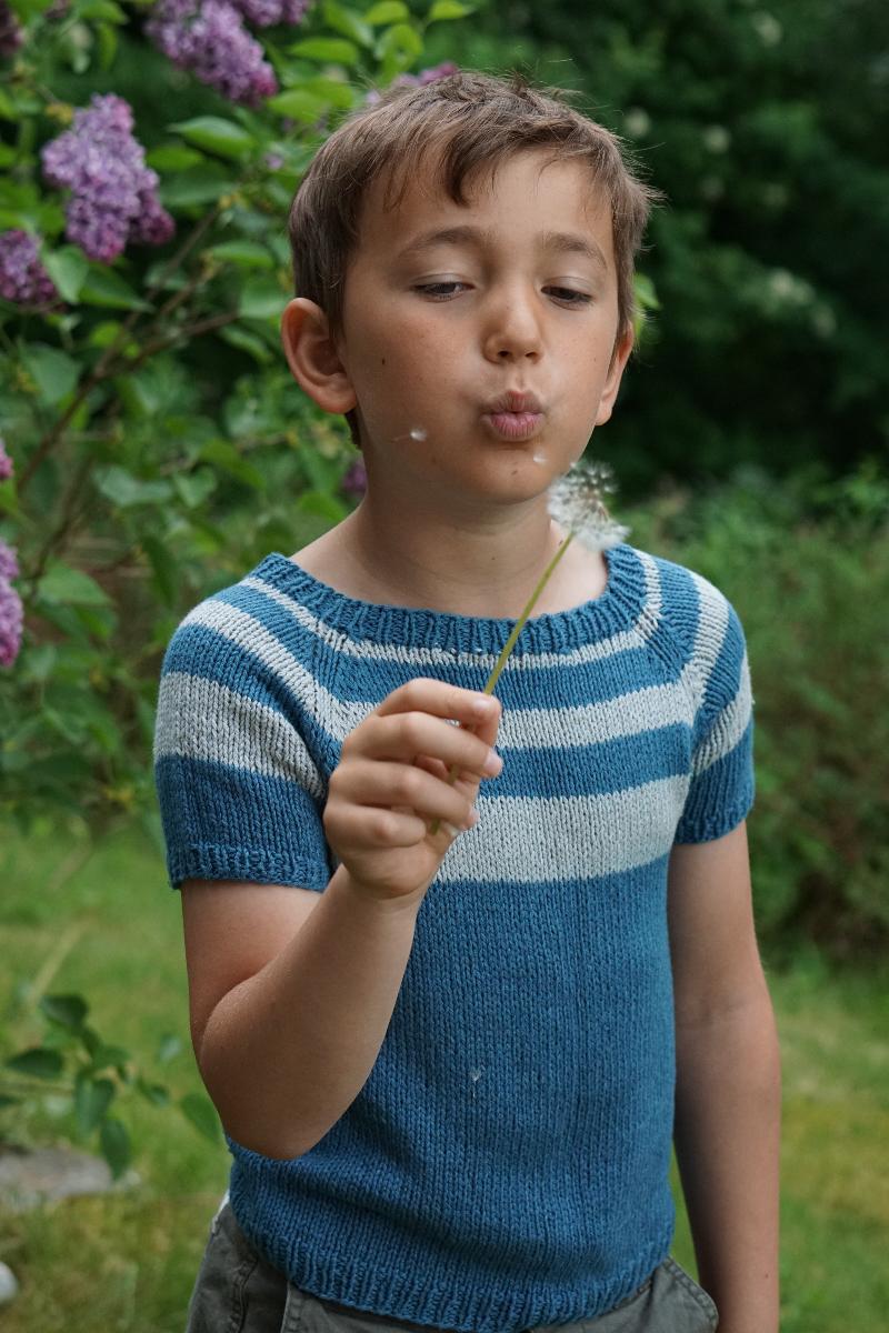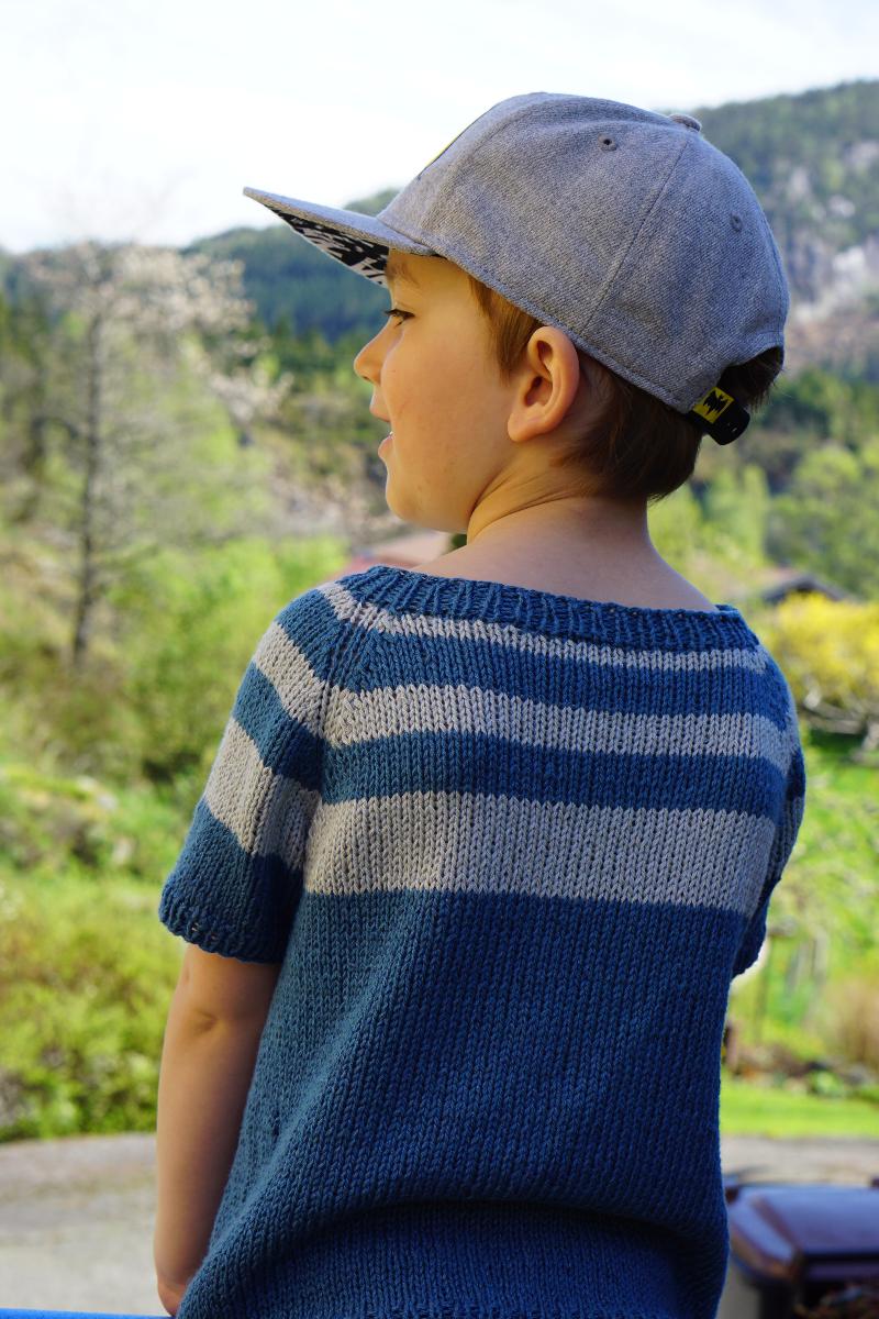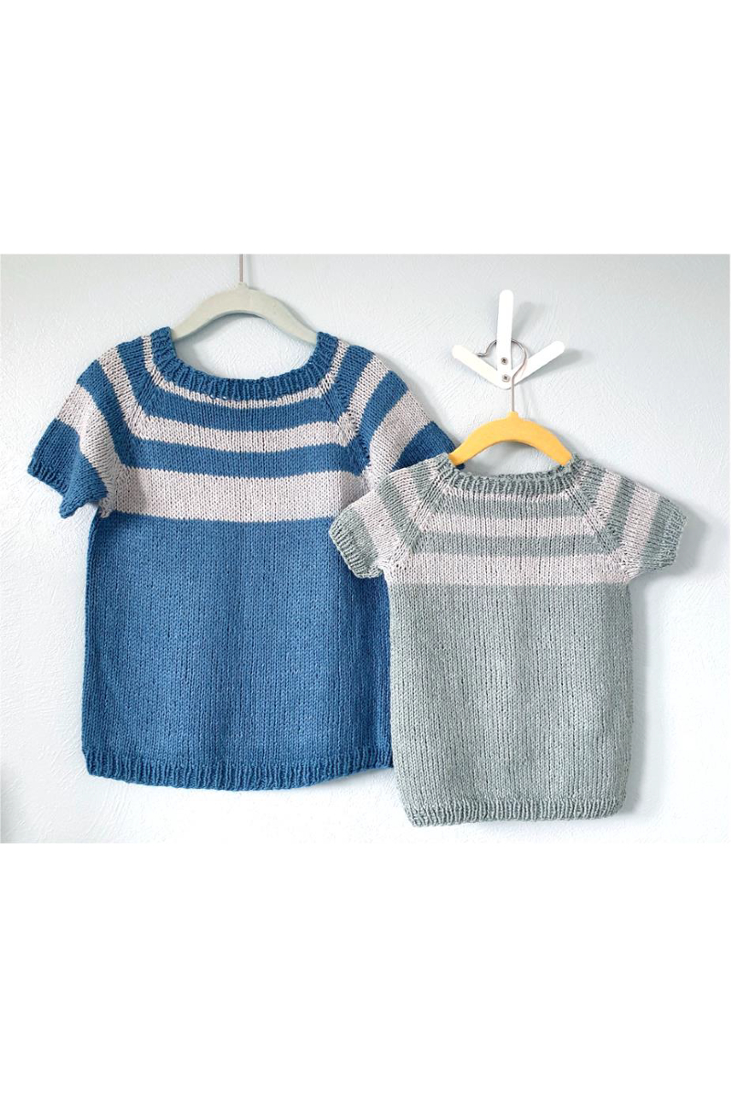 Dette er en sval, sommerlig T-skjorte som strikkes i lin/bomullsgarn. T-skjorten passer ypperlig til både shorts, jeans og skjørt, og du kan variere fargene akkurat slik du vil, så du får en helt unik T-skjorte til ditt barn! T-skjorten er strikket med litt ekstra lengde for at den kan vare i flere sommere.