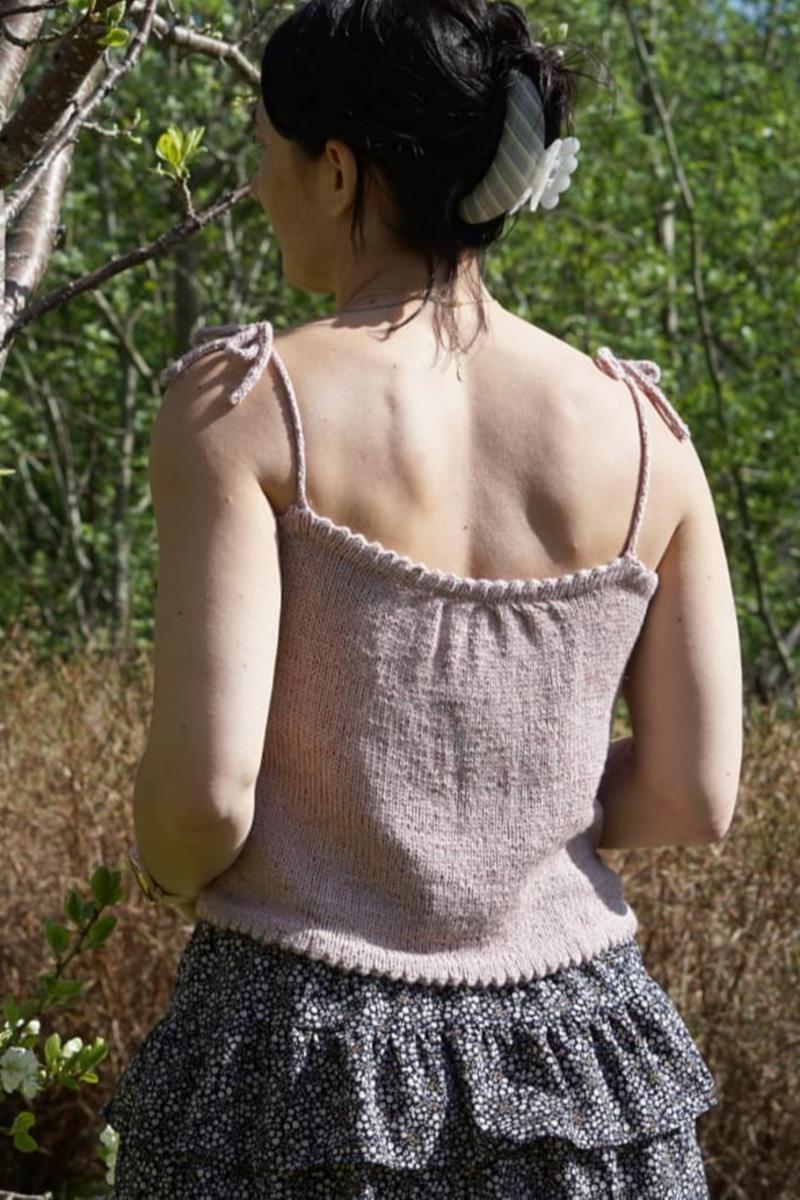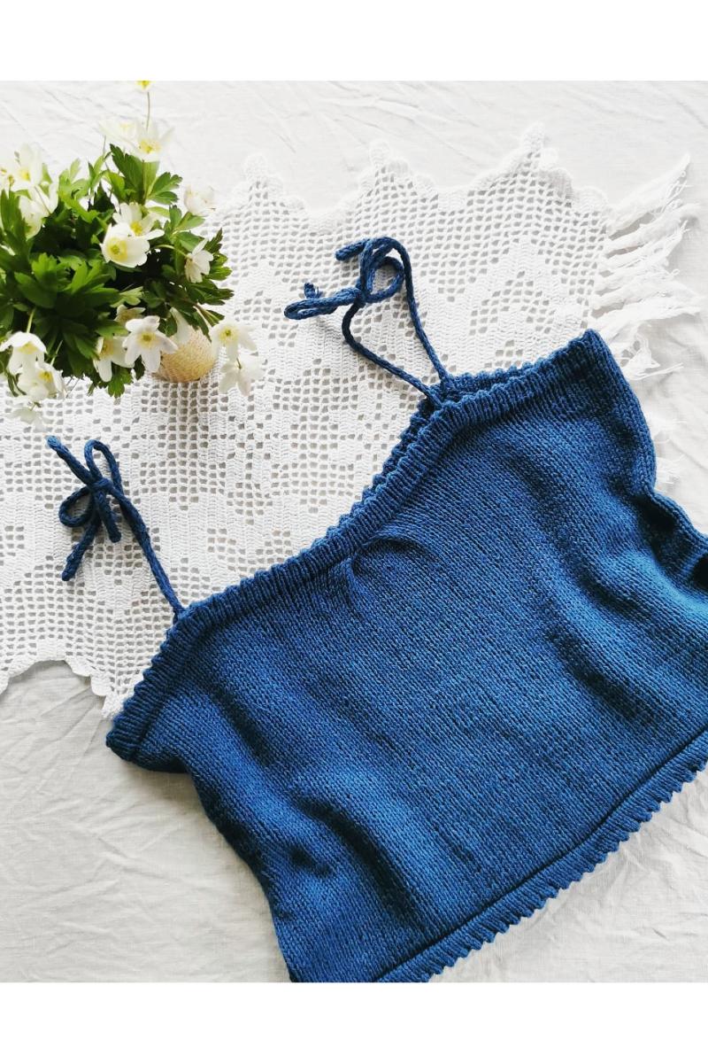 Sunny singlet er en sommertopp med et enkelt, men feminint uttrykk. Du kan strikke den i enkel tråd lin eller bomullsgarn. Singleten strikkes nedenfra og opp, med valgfri innsving. Du kan velge om du vil ha spagettistropper, knyte dem oppå skulderen, eller ha dem uten knyting. Du kan også velge å droppe stroppene og bare bruke toppen som tubetopp. For å få litt mer hold i den, så kan man da tre i en buksestrikk i løpegangen øverst.