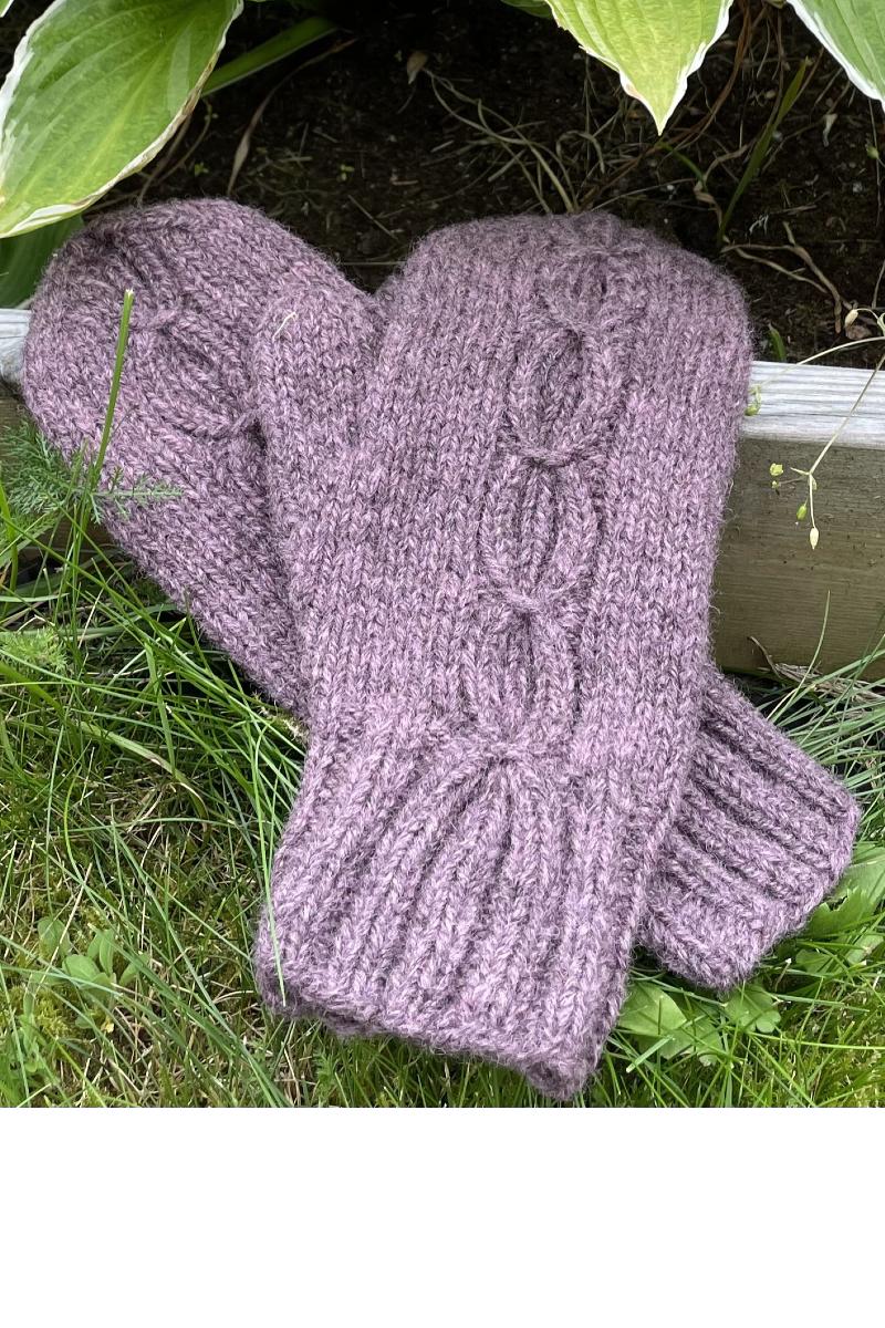 De er strikket i dobbel finull fra Rauma garn. Den unike tommelkilen, sammen med flettemønstret gir en veldig god passform. Vottene kan justeres på lengde etter ønske, og oppleves de store i størrelsen kan de, med fordel, toves lett.