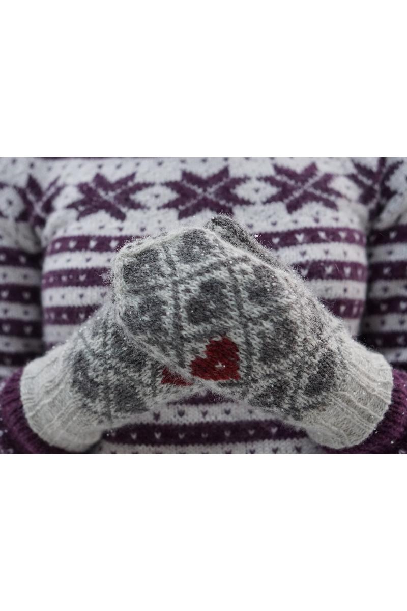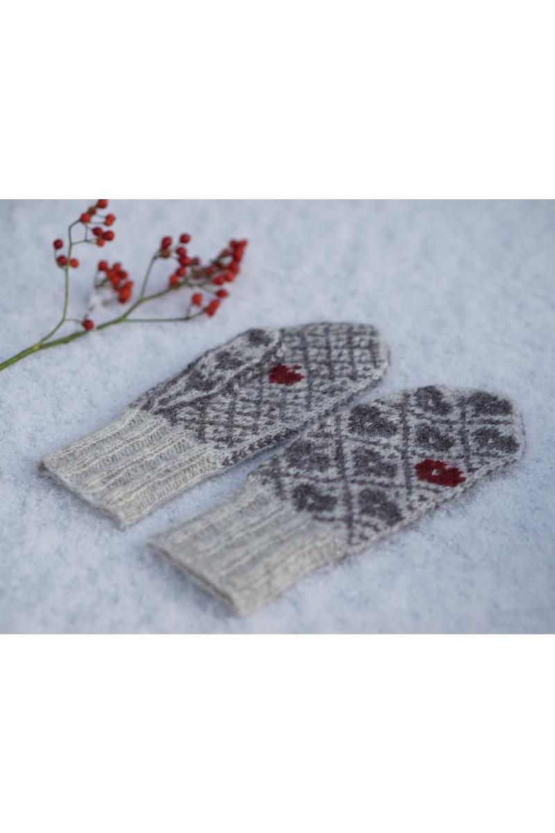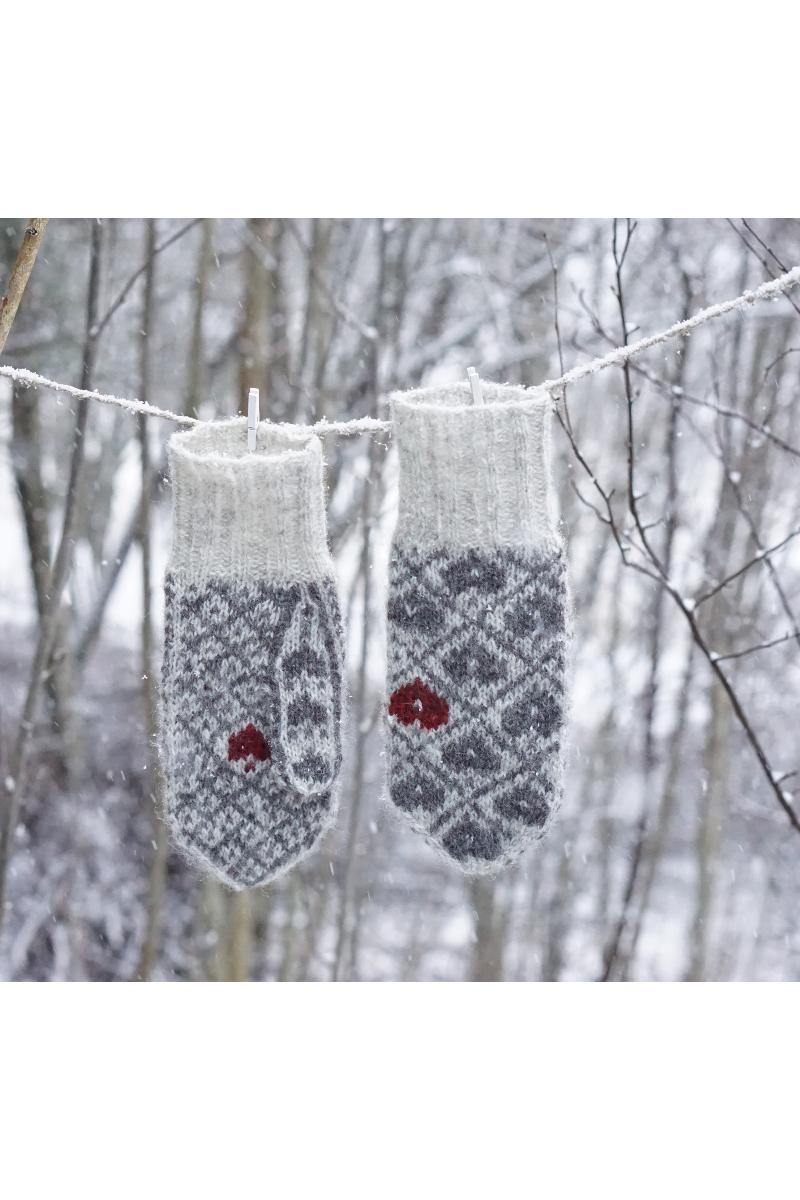 Disse vottene er en feminin vott med julemotiv, men som fint også kan brukes hele vintersesongen. Votten strikkes i rent ullgarn, for å gi ekstra varme på kalde vinterdager. Mønsteret er det samme for alle størrelser, bortsett fra den minste størrelsen, som har eget diagram. Bruk lys eller mørk mønsterfarge etter som hva du synes blir penest. Broder gjerne med en kontrastfarge på et eller flere av hjertene.