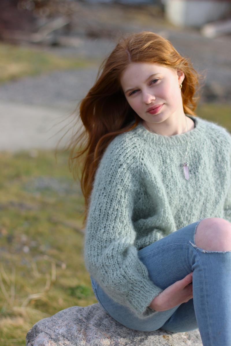Genseren strikkes ovenfra og ned, med raglanøkning og puffarmer.