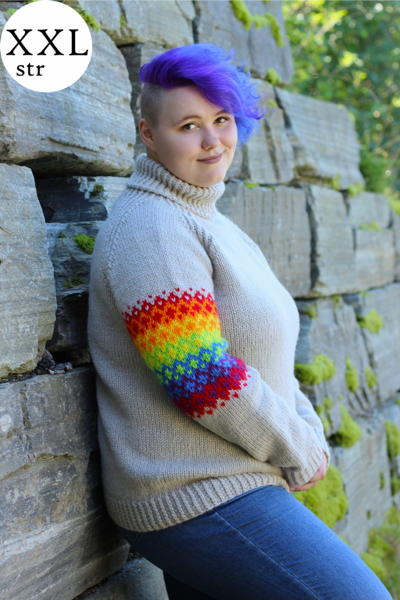 Identity setter farge på den gråe hverdagen. Genseren er lett å strikke, men hold tunga rett i munnen – regnbuens farger skal på riktig plass! Regnbuemønsteret som er plassert på hver arm, kommer godt frem med klare farger. Kan en regnbue holde deg varm? Så absolutt. Denne kan bæres med stolthet av alle og enhver. Vi gleder oss til å se akkurat deg, eller noen du er glad i med denne genseren