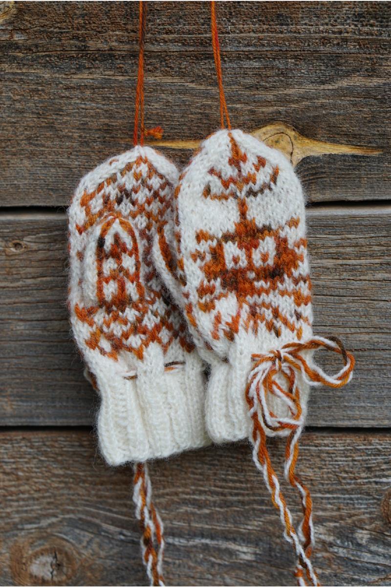 Finull fra Rauma Garn. Garnmengde: Ca 25 g bunnfarge og 25 g mønsterfarge (finull). Noe mindre mønsterfarge om denne ikke brukes til vrangbord.