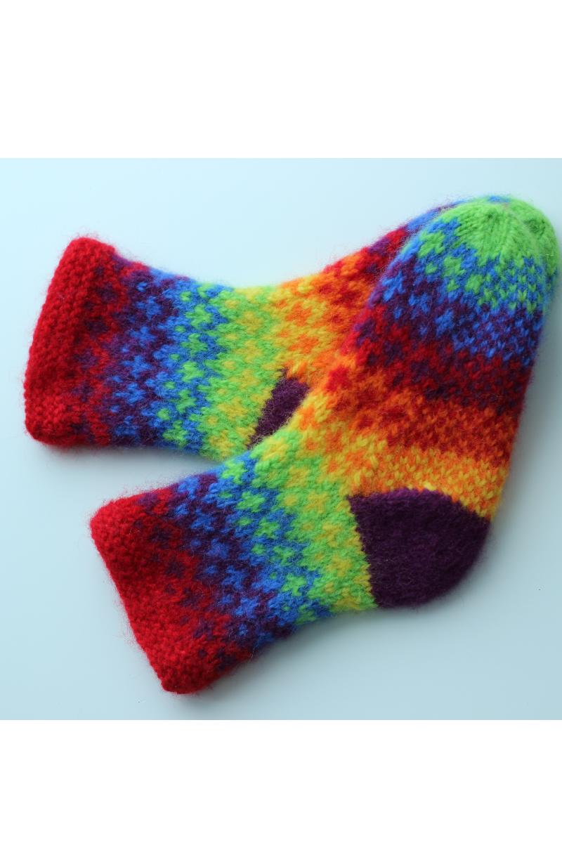 Superkule og fargerike tovede sokker. Alle vil elske disse! Sokkene er laget i dame og herrestørrelse, men ønskes de mindre, så kan de toves litt mere.