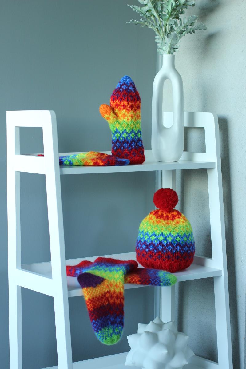 Unn deg en flott og fargesprakende strikkepakke med matchende lue, votter og tova sokker!