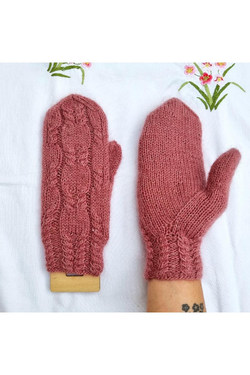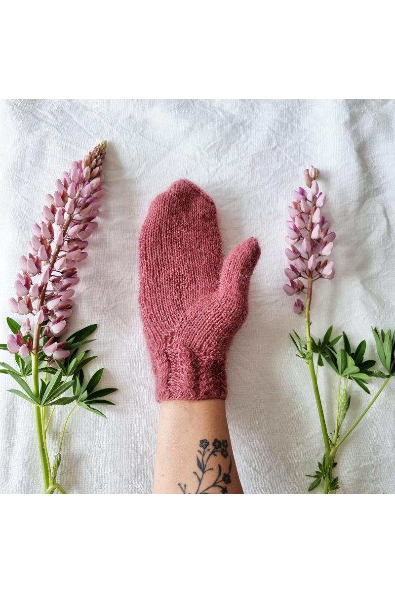 Lupinvotter er en inntilsittende vott som strikkes i en tråd tynn ull, kombinert med en tråd mohair. Votten strikkes med fletter på håndbaksiden av votten, og i håndflata strikkes økninger til tommelkilen på en vakker måte, slik at det blir seende ut som en fin livslinje inni hånda.