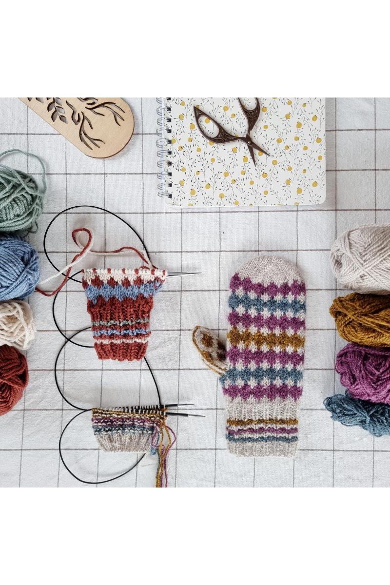 Harlequinvotterer designet spesielt for å få brukt opp restegarn. Vottene kan strikkes i 2 ulike strikkefastheter, og med 3ulike garnalternativ, se info under. Vottene strikkes med samme mønster i håndflate og på håndbaken. Tommelen strikkes med kile. Nederst i oppskriften finner du også en forenklet versjon av vottene, der de strikkes uten kile, og høyre og venstre vott strikkes identiske. Om du bruker Finull, så har vottene godt av en runde med lett toving tilslutt. Det totale antallet med farger og rekkefølgen på disse, bestemmer du helt selv. Gå på jakt i eget garnlager, finn farger du liker, og sett sammen din helt egne fargekombinasjon på vottene.